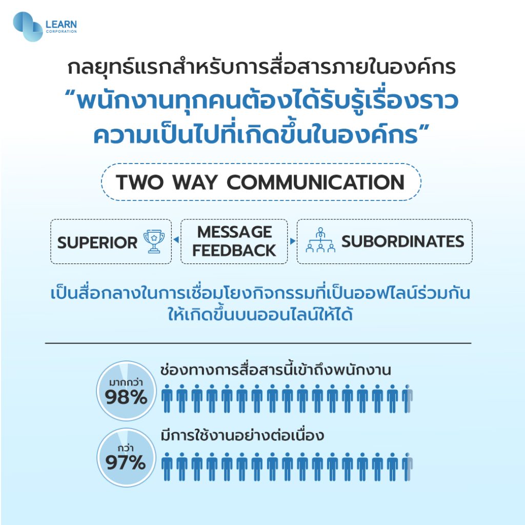 ความสำเร็จภายในองค์กร นอกจากกลยุทธ์การบริหาร พนักงานที่มีความเชี่ยวชาญแล้ว สิ่งที่สำคัญมากอีกอย่าง คือ การสื่อสารภายในองค์กร ยิ่งเป็นองค์กรที่มีขนาดใหญ่มากเท่าไหร่ การสื่อสารจะต้องเน้นความทั่วถึงและความชัดเจนให้ได้มากที่สุด เพื่อสร้างความเข้าใจที่ตรงกันและแสดงถึงความใส่ใจกับพนักงานทุกระดับด้วย ซึ่ง Learn Coporation เอง เป็นองค์กรที่เติบโตขึ้นเรื่อย ๆ มีพนักงานเพิ่มมากขึ้นในแต่ละหน่วยงาน จึงให้ความสำคัญกับการสื่อสารภายในองค์กรให้มีประสิทธิภาพมากที่สุด