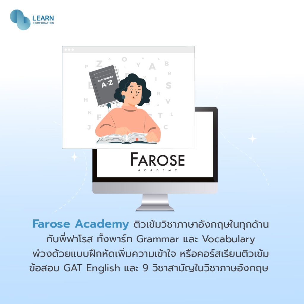 ติวเข้มวิชาภาษาอังกฤษในทุกด้านกับพี่ฟาโรส ทั้งพาร์ท Grammar และ Vocabulary พ่วงด้วยแบบฝึกหัดเพิ่มความเข้าใจ หรือคอร์สเรียนติวเข้มข้อสอบ GAT English และ 9 วิชาสามัญในวิชาภาษอังกฤษ ที่นี่ก็ได้รับการตอบรับจากนักเรียนด้วยสถิติคะแนนสูงมากทุกรอบการสอบ จากเทคนิคเฉพาะของพี่ฟาโรส